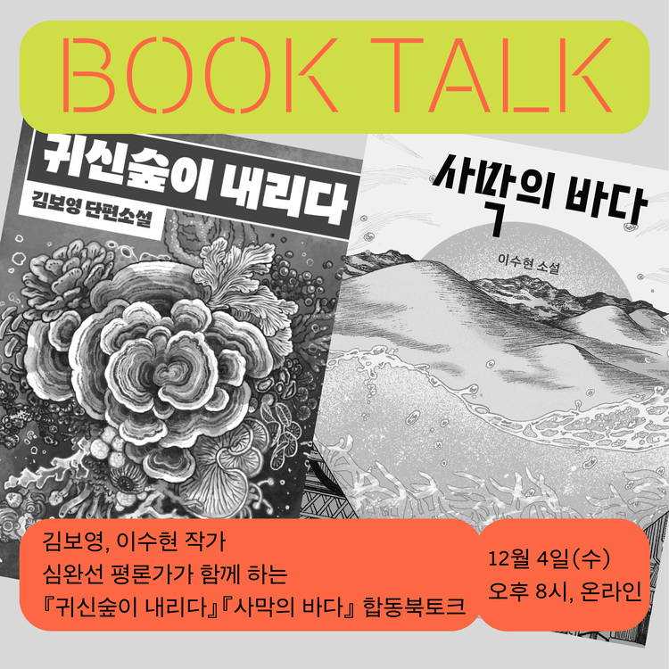 『귀신숲이 내리다』 + 『사막의 바다』 합동 북토크 프로그램 일시: 12월 4일 수요일 오후 8시 ~ 10시 (120분)프로그램 방식: 온라인(줌)유의사항- 신청하신 분들께는 프로그램 당일 오전(12/4) 참여