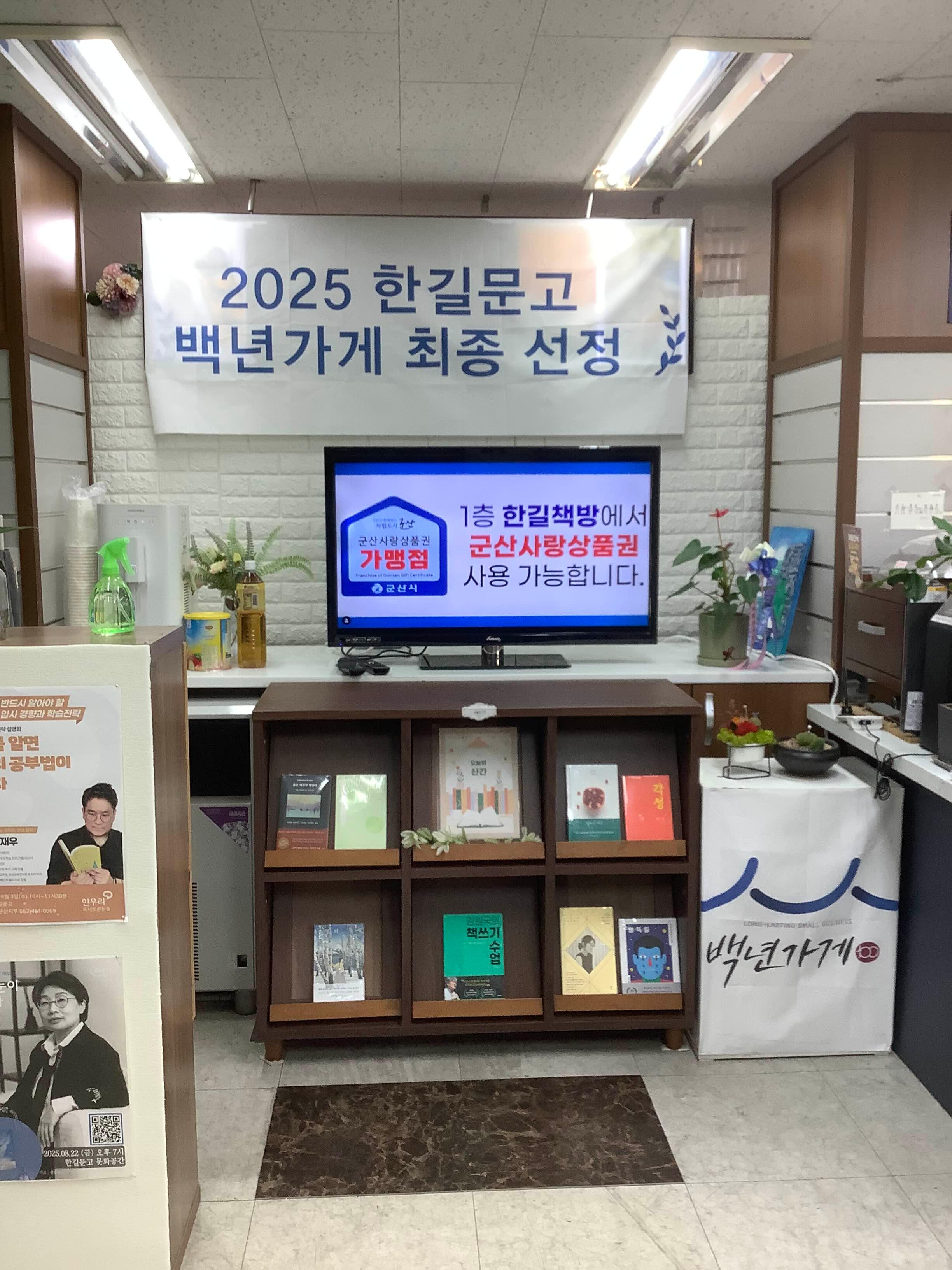 5. 2025년에 백년가게로 선정되었다고 합니다. 축하드립니다. 한길문고는 1987년에 “녹두문고”로 시작했고, 원래 지하에 있었다가 2012년 폭우로 책 10만권이 물에 잠겼는데 당시 군산시민이 힘을 합쳐 복구했다고 합니다. 사장님께서 “시민과 함께 한다고 생각하고 있어요.”라고 하십니다. 군산에서 사회운동을 하시던 이민우씨께서 시작하셨고 지금은 아내분이 뒤를 이어 운영하고 계시다고 합니다. 매달 작가와의 만남을 한다고 해요.