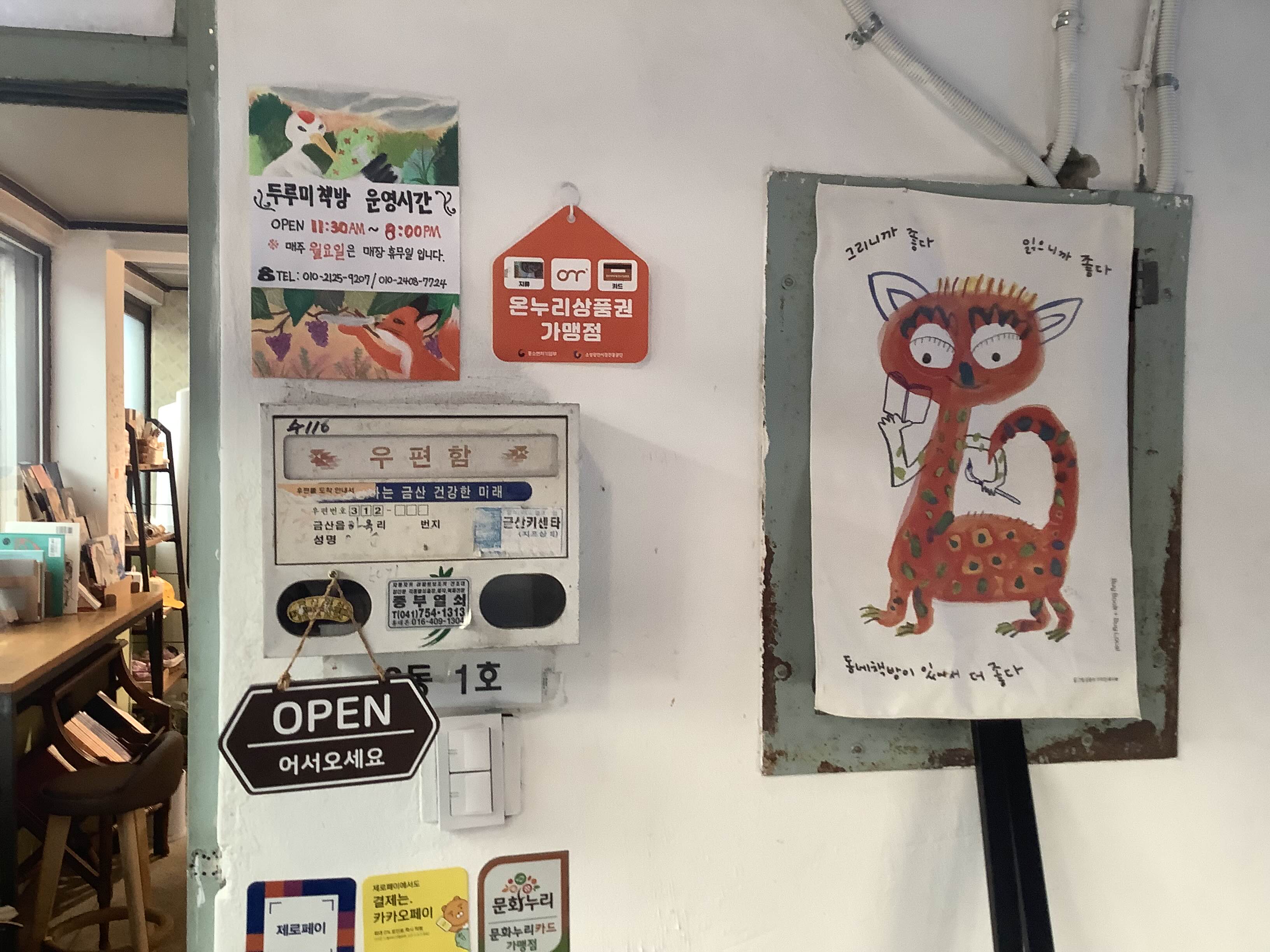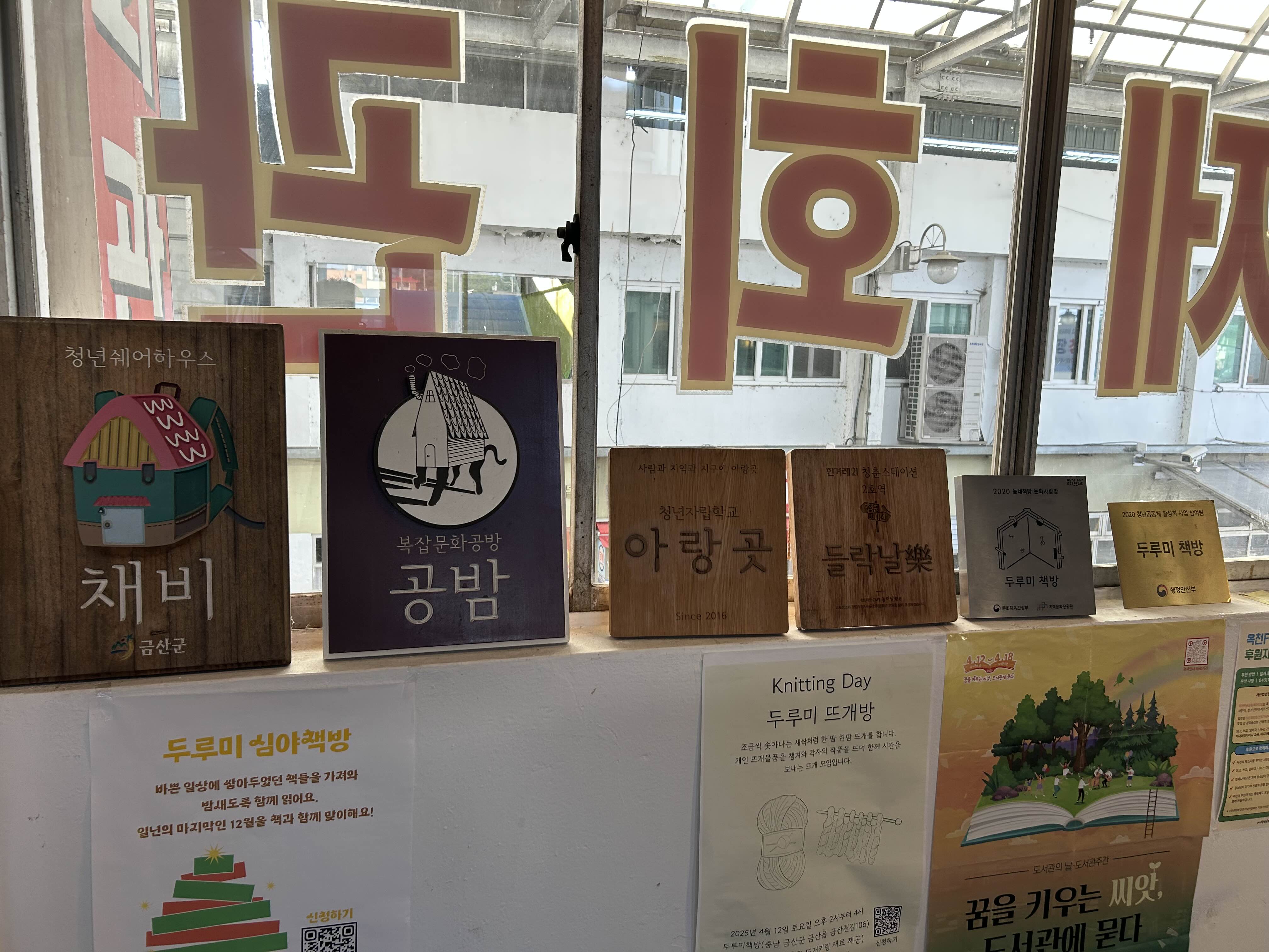 두루미책방은 금빛시장 청년몰에서 시작했다가 남이면 숲속마을을 거쳐 2024년 다시 금빛시장 국제회관으로 돌아왔다고 합니다. 금산에 두개 뿐인 서점 중 하나로, 당시 지역주민과 아이디어를 모으고, 같이 벽을 칠하고 책장을 만들며 지역주민과 함께하는 서점이 되었다고 합니다.
